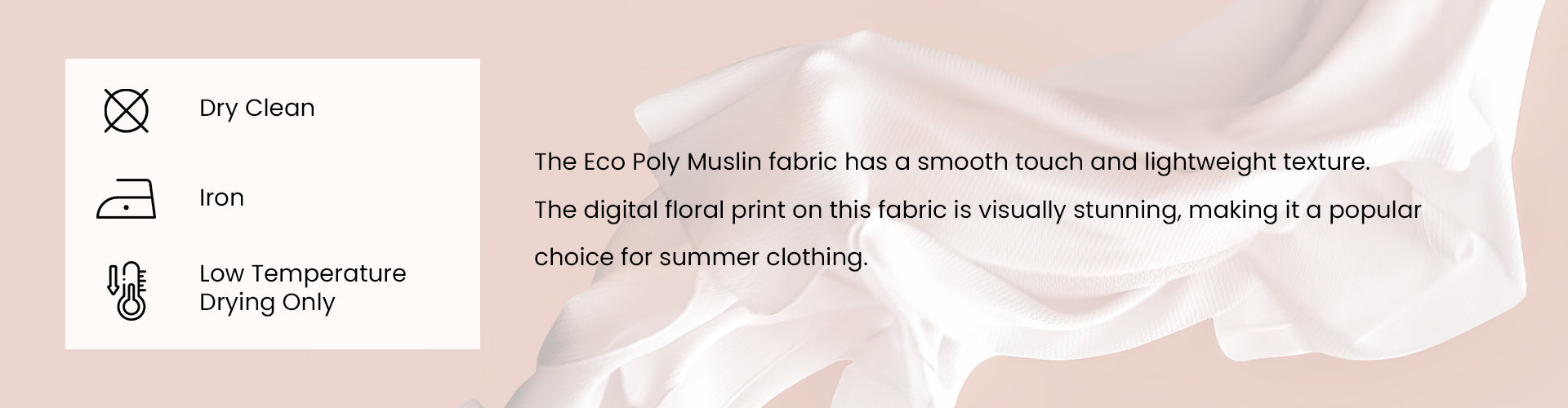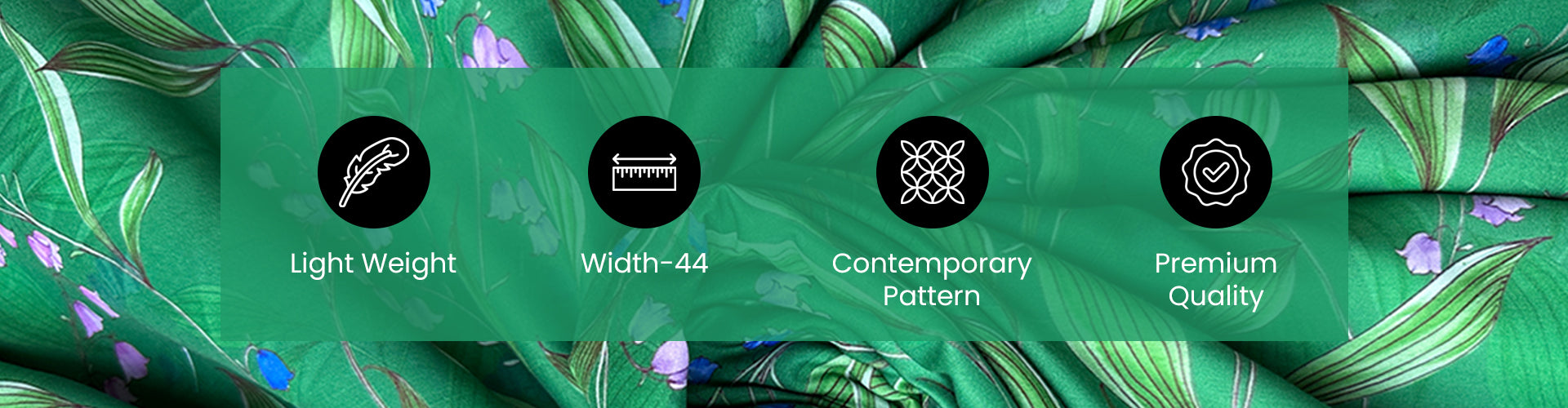 This Eco Poly Muslin fabric has a smooth touch and lightweight texture. The digital floral print on this fabric is visually stunning, making it a popular choice for summer clothing. The fabric's green color adds a refreshing touch to the design.