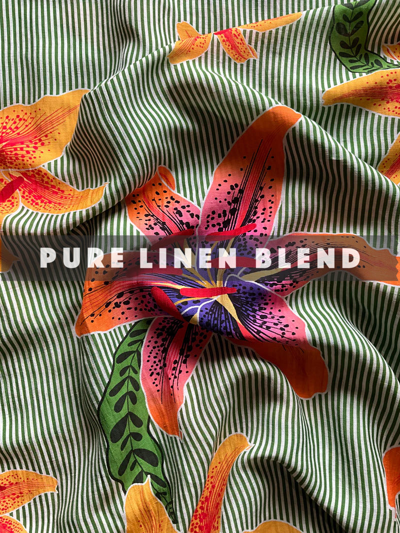 With its contemporary prints and refined design, our pure linen blend fabric offers a luxurious feel at a competitive price, perfect for fashion-forward individuals and designers seeking both quality and affordability.