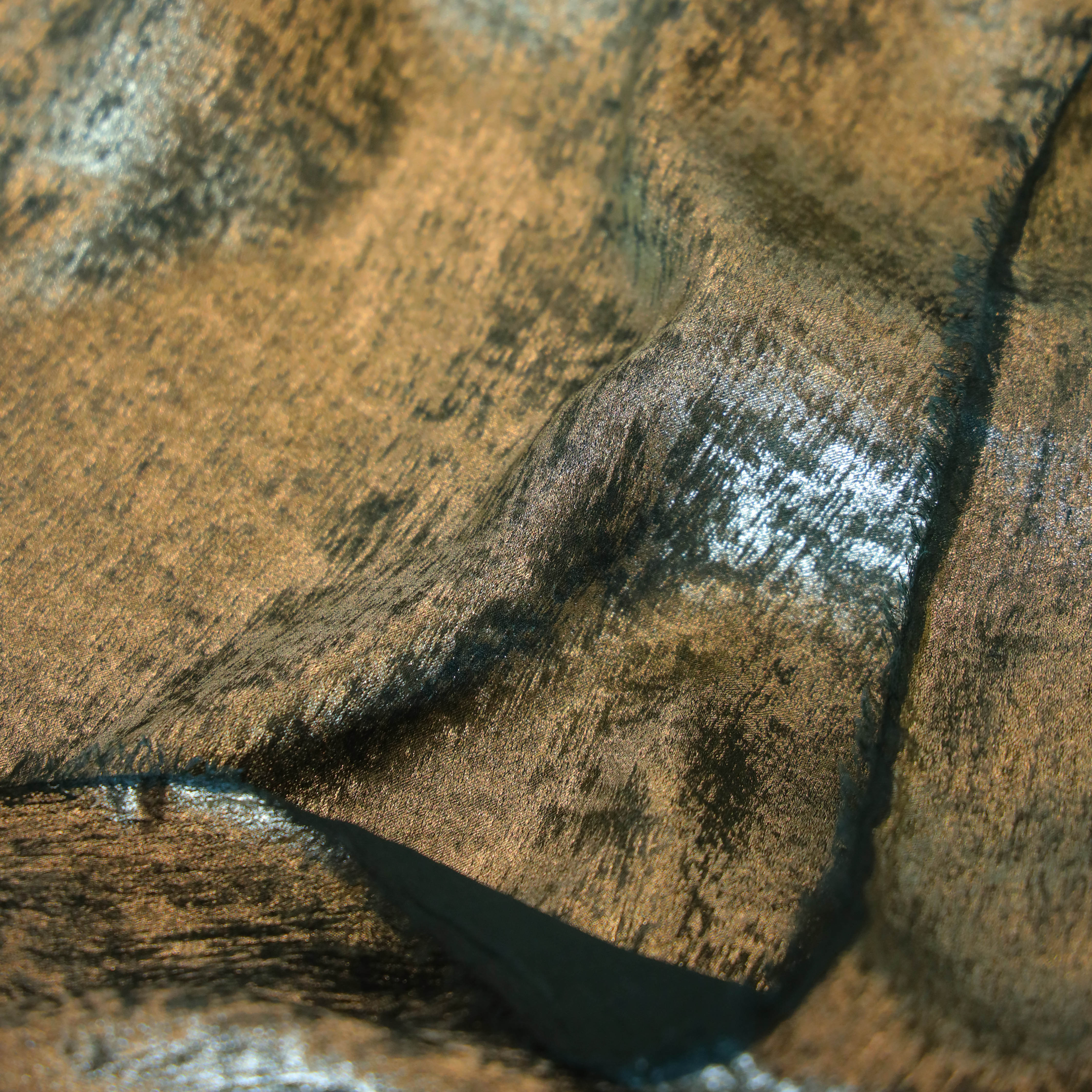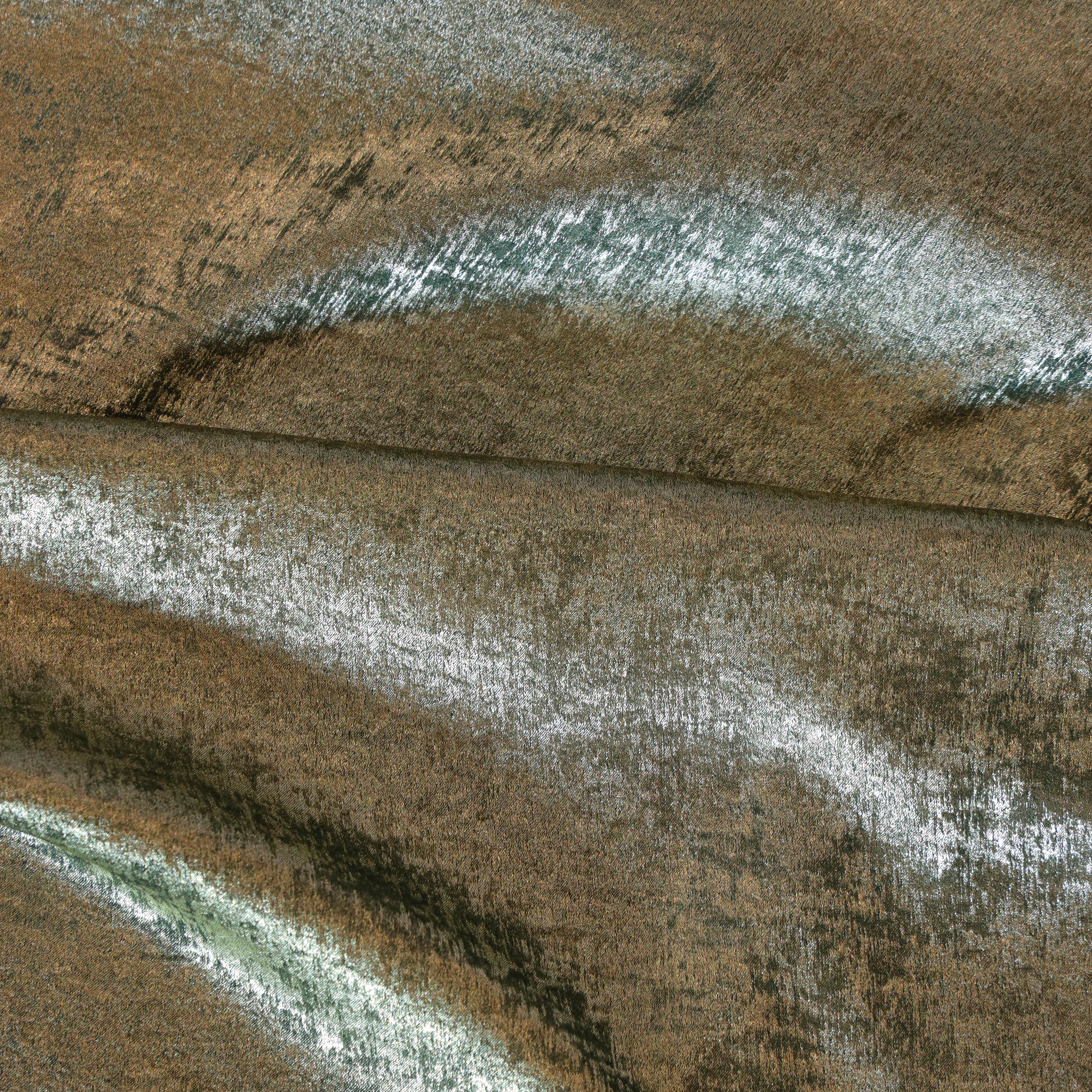 The image captures a close-up view of a luxurious fabric with a soft, shimmering surface. The material appears to be velvet or a similar plush textile, with a smooth and lustrous sheen that reflects light in varying intensities. Gentle folds and ripples create a natural play of highlights and shadows, emphasizing the fabric’s rich texture and fluid drape. The color is a muted champagne-taupe with silvery undertones, giving it an elegant, almost metallic glow. The overall effect is sophisticated and tactile, evoking a sense of luxury and refinement.