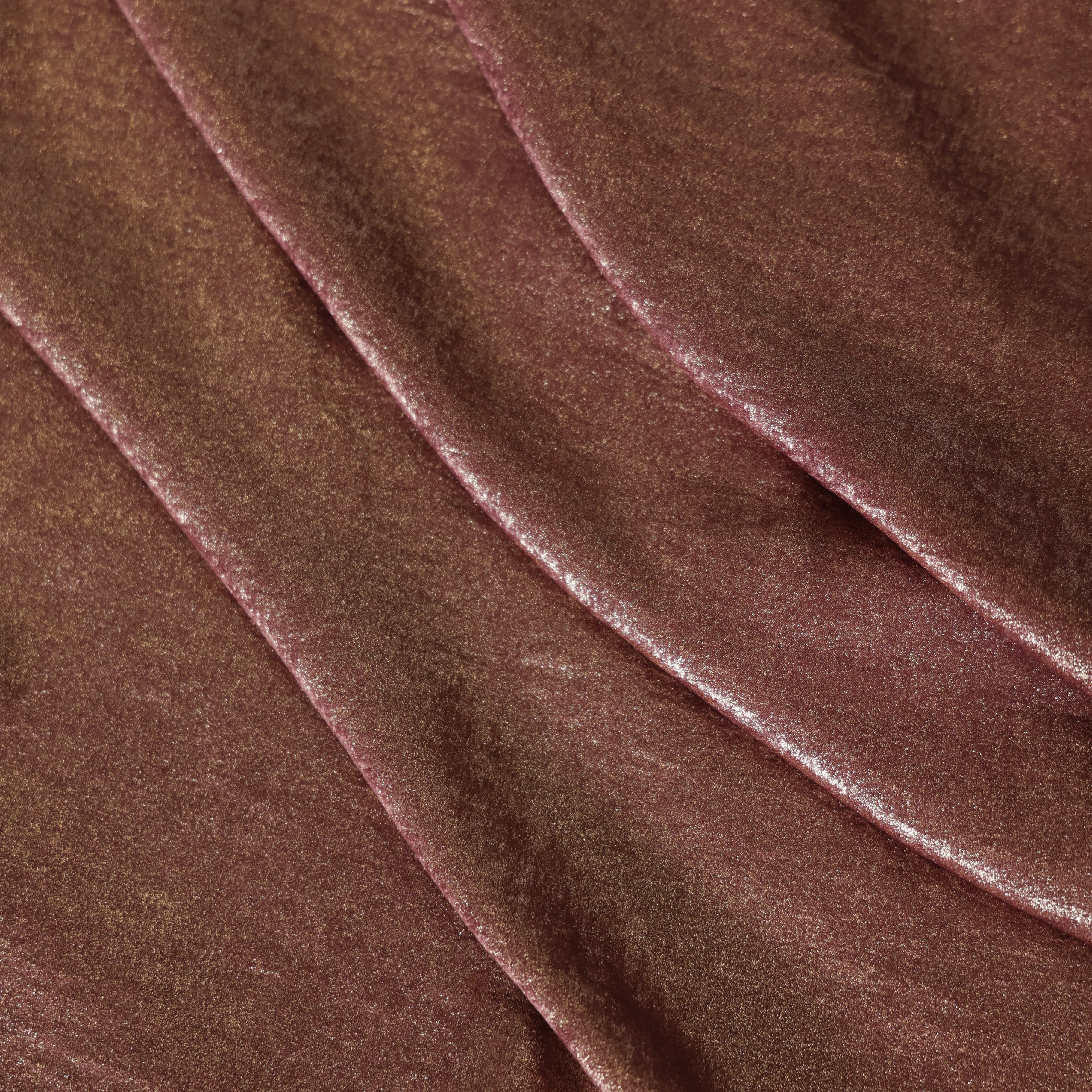 The image captures a close-up view of a luxurious fabric with a soft, shimmering surface. The material appears to be velvet or a similar plush textile, with a smooth and lustrous sheen that reflects light in varying intensities. Gentle folds and ripples create a natural play of highlights and shadows, emphasizing the fabric’s rich texture and fluid drape. The color is a muted champagne-taupe with silvery undertones, giving it an elegant, almost metallic glow. The overall effect is sophisticated and tactile, evoking a sense of luxury and refinement.