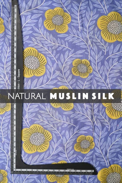 Introducing our Floral Pattern Yellow, Mauve Background Printed Natural Muslin Silk Fabric, a luxurious choice for your wardrobe with a touch of natural elegance.