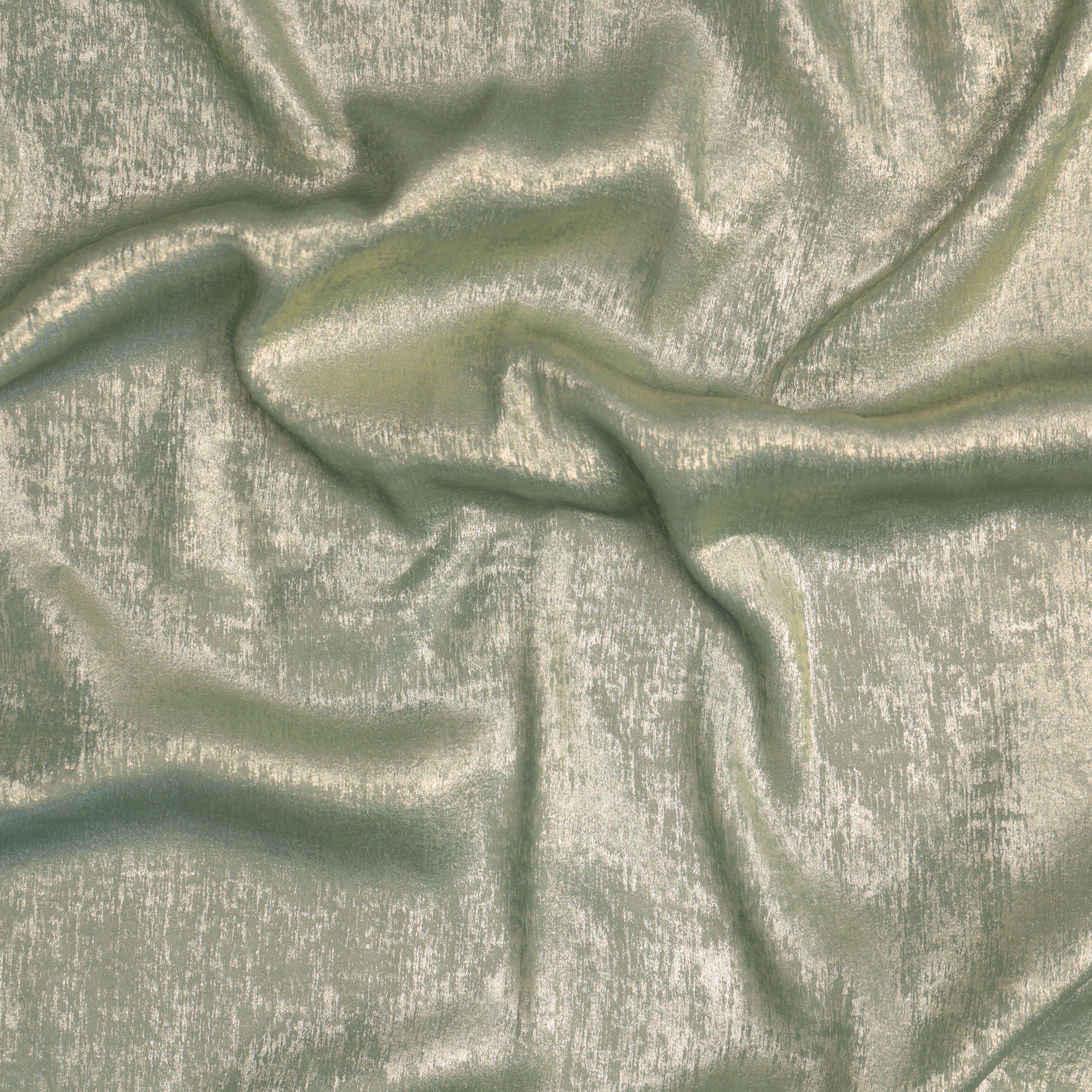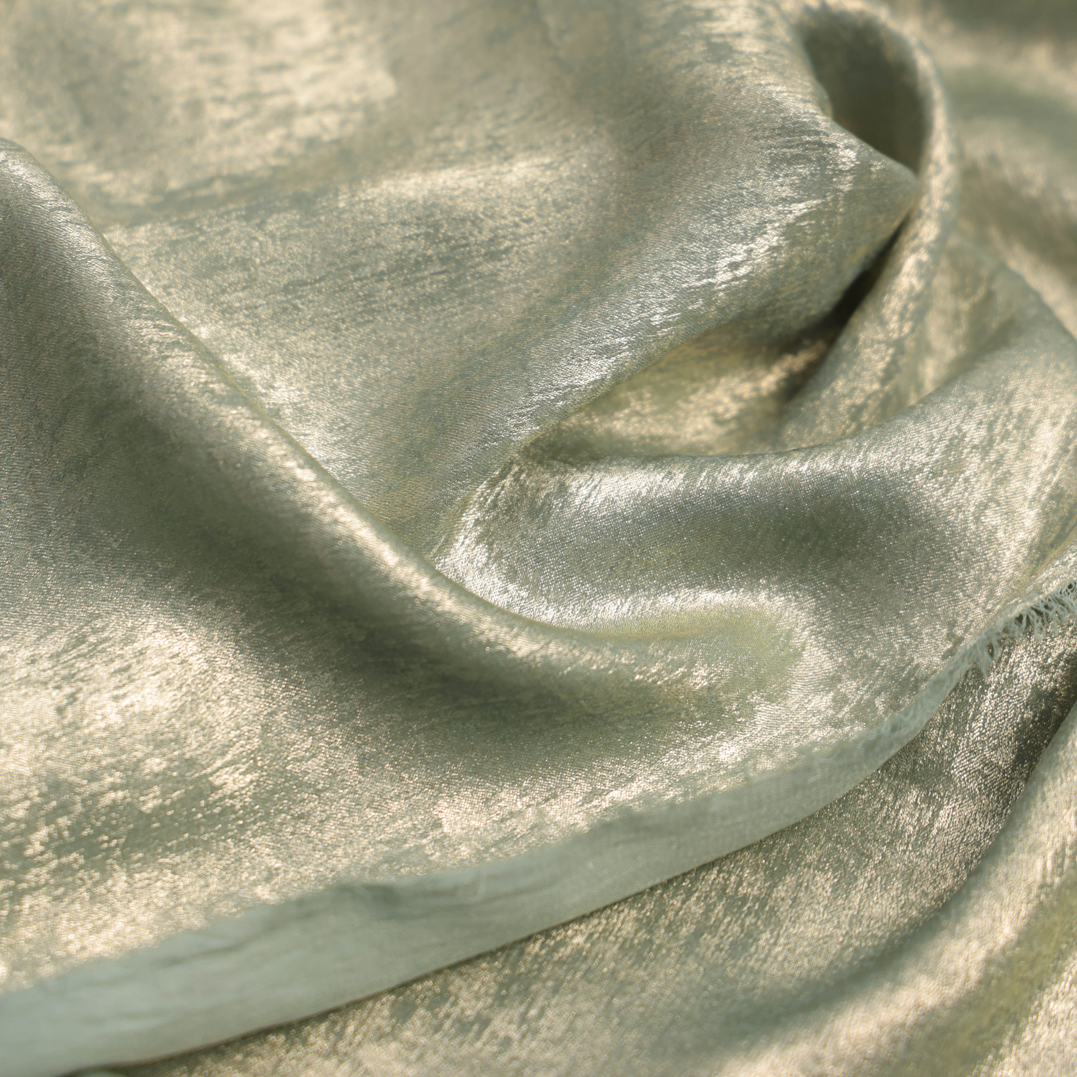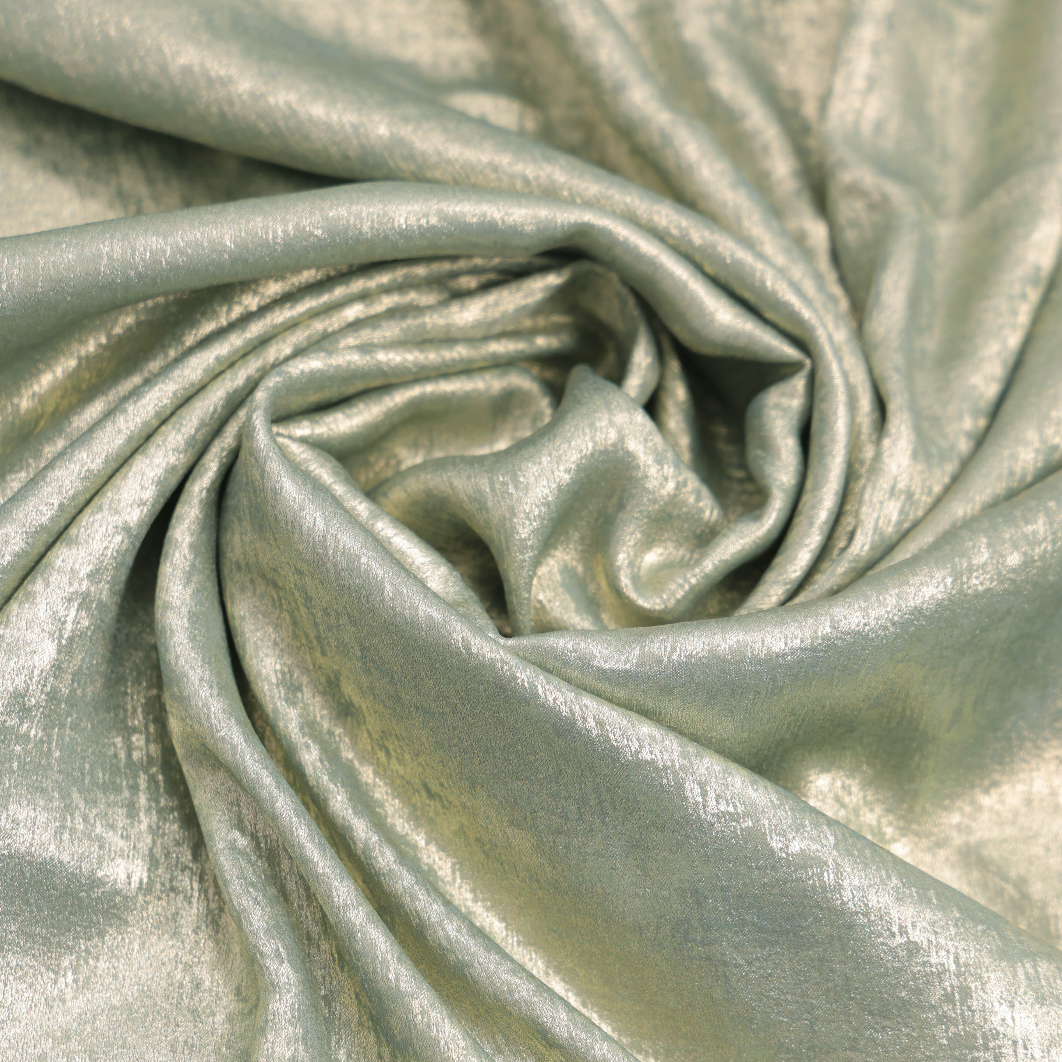 The image captures a close-up view of a luxurious fabric with a soft, shimmering surface. The material appears to be velvet or a similar plush textile, with a smooth and lustrous sheen that reflects light in varying intensities. Gentle folds and ripples create a natural play of highlights and shadows, emphasizing the fabricβs rich texture and fluid drape. The color is a muted champagne-taupe with silvery undertones, giving it an elegant, almost metallic glow. The overall effect is sophisticated and tactile, evoking a sense of luxury and refinement.