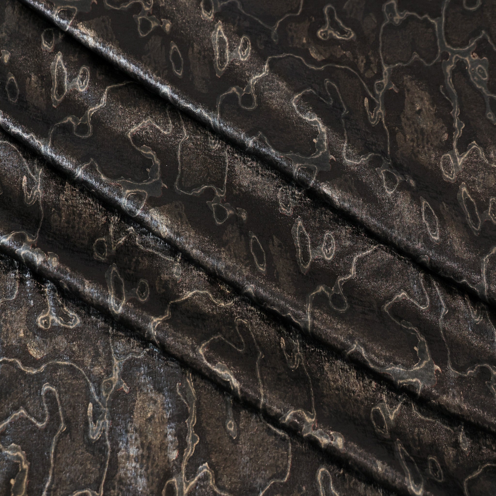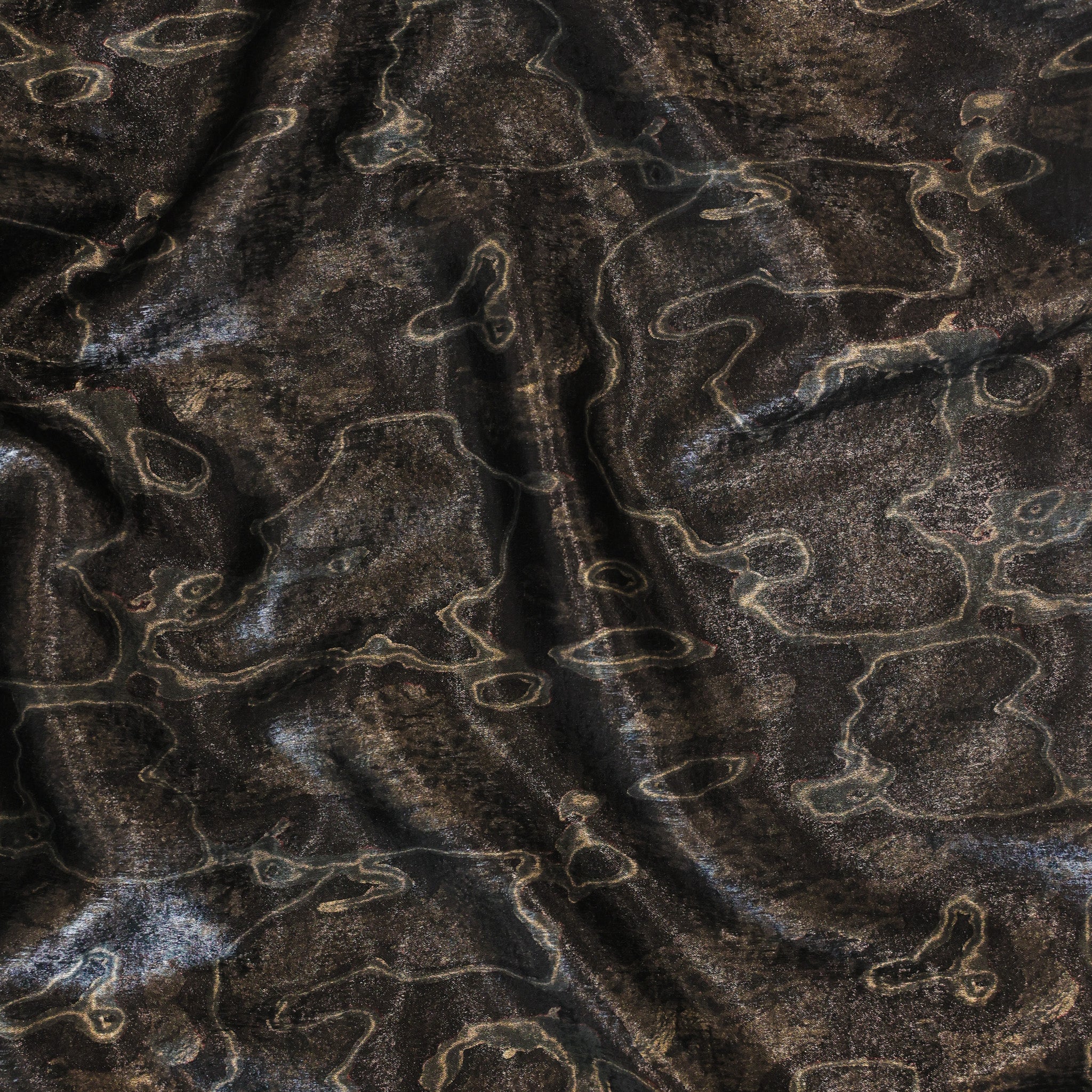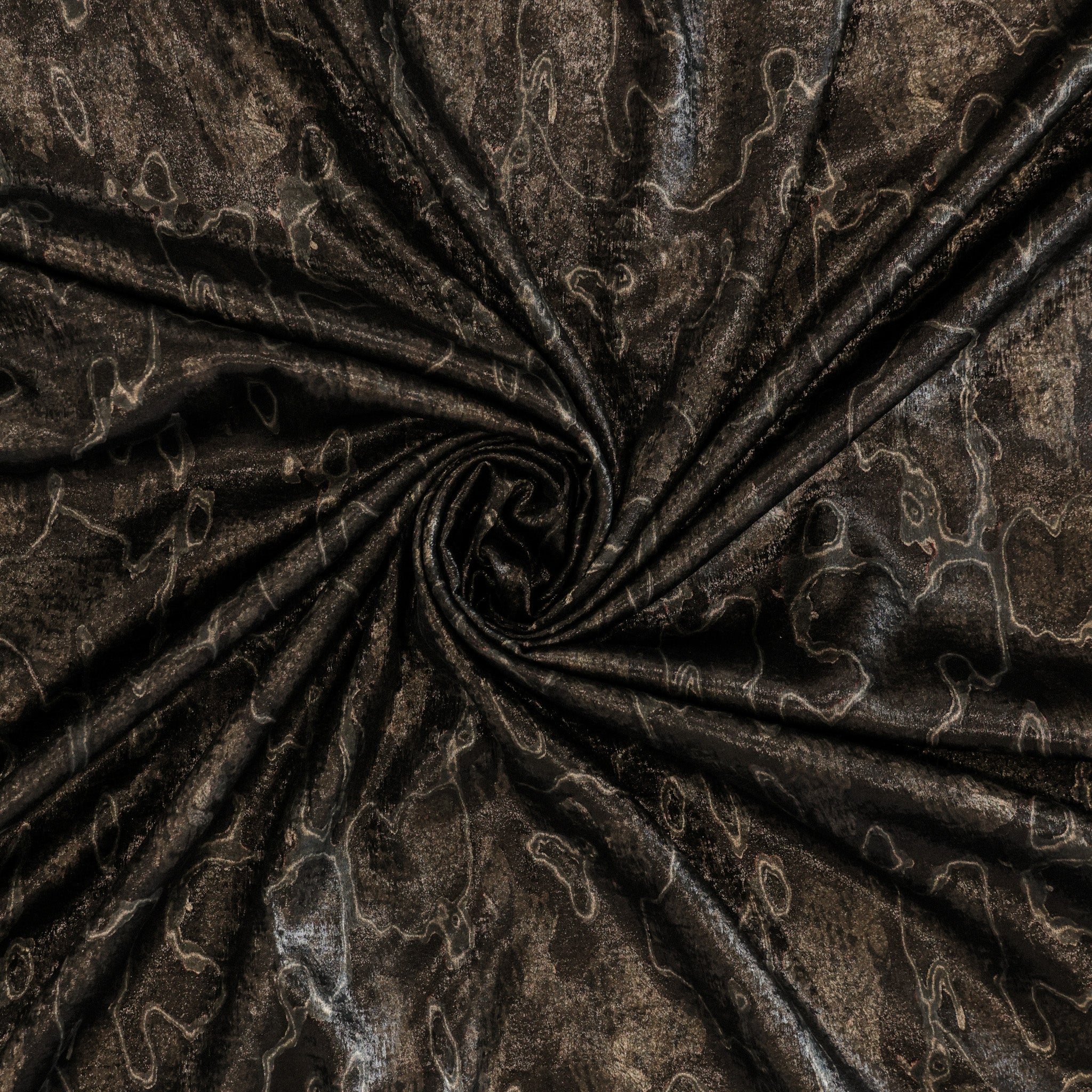 This fabric features a rich black and deep charcoal base with a unique marble-effect pattern running across the surface. The subtle metallic highlights in shades of soft gold and muted silver create a fluid, stone-like texture that gives the fabric a luxurious and artistic look.
