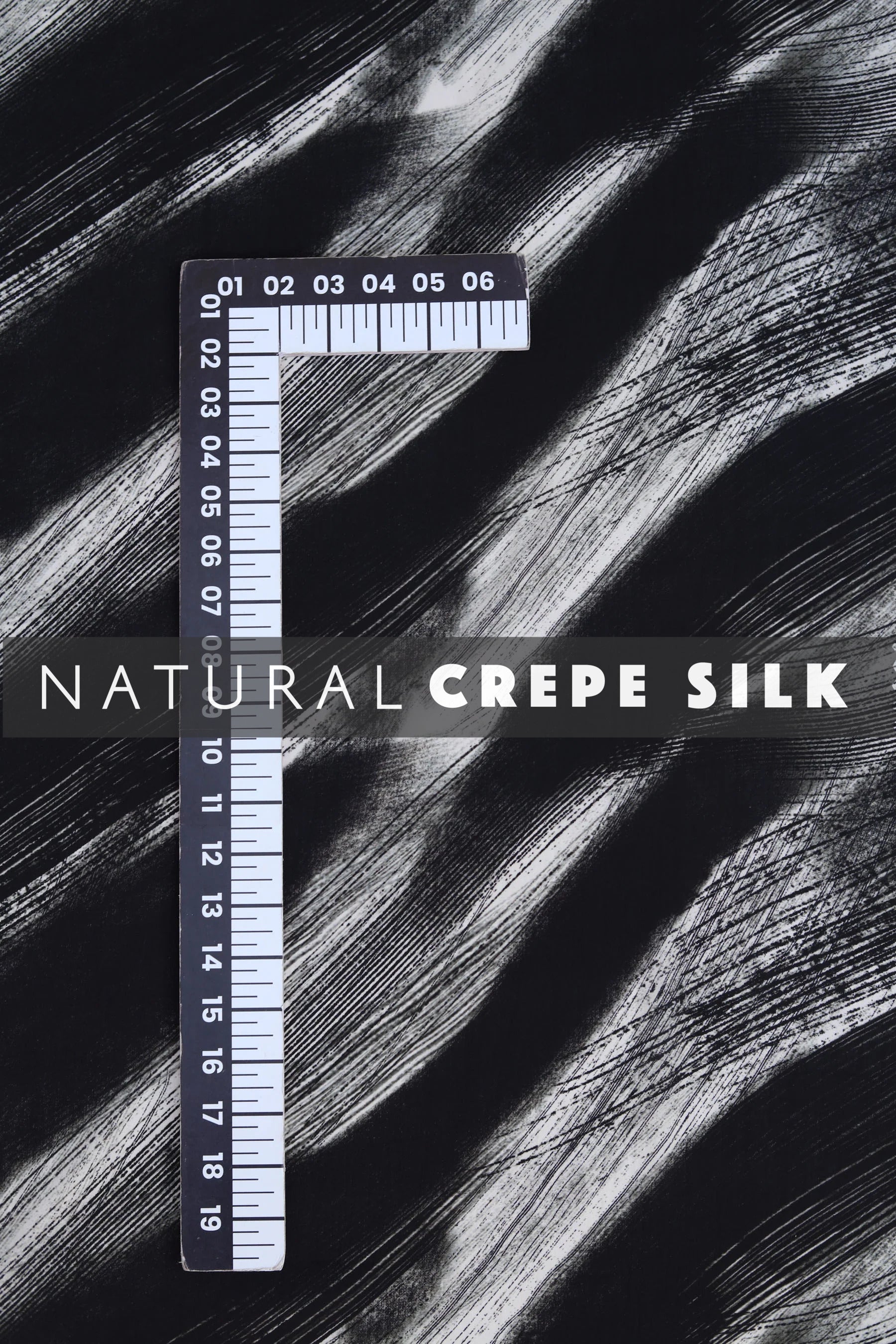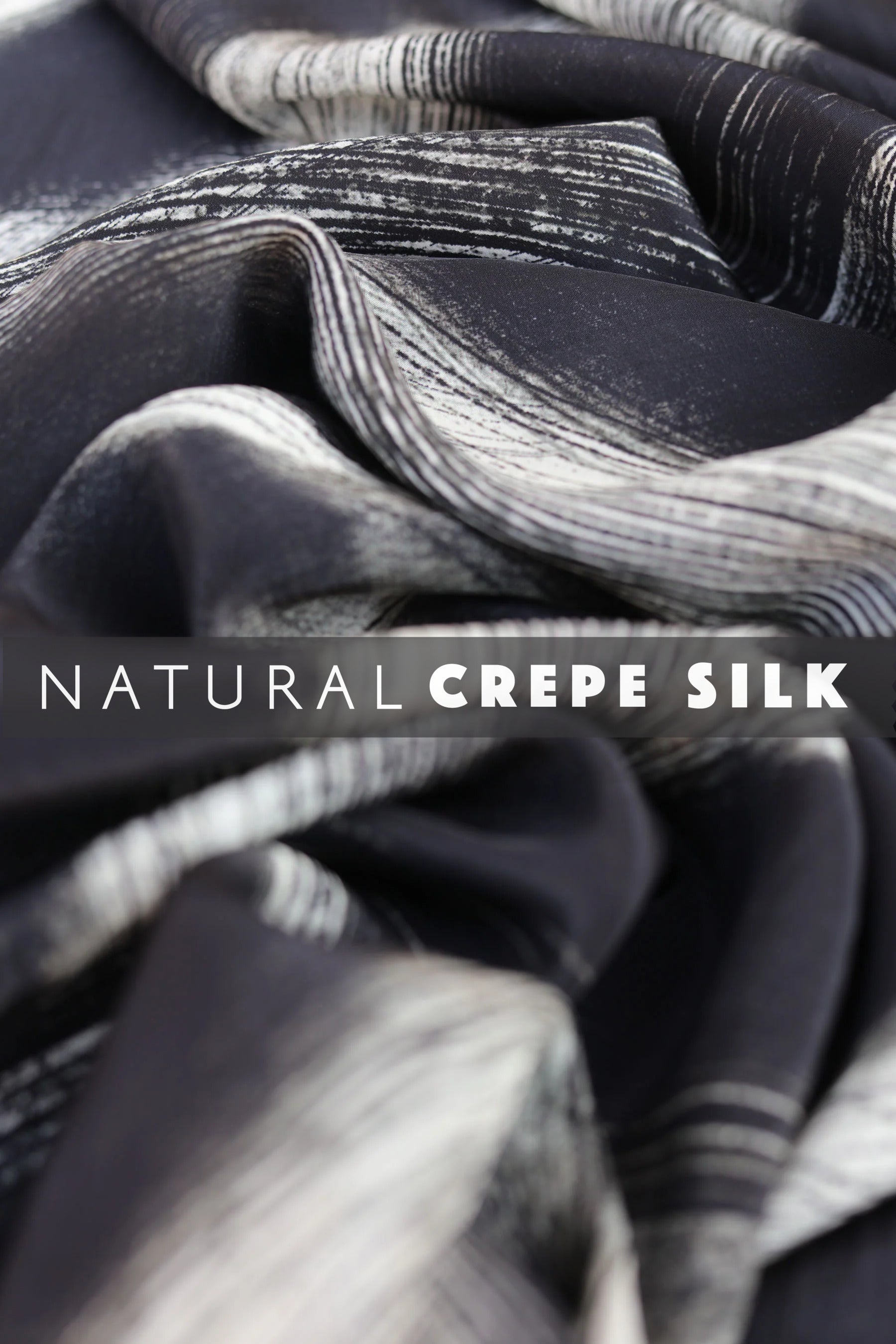 Black and Off White Sketchy Textured Pattern Printed Natural Crepe Silk Fabric
