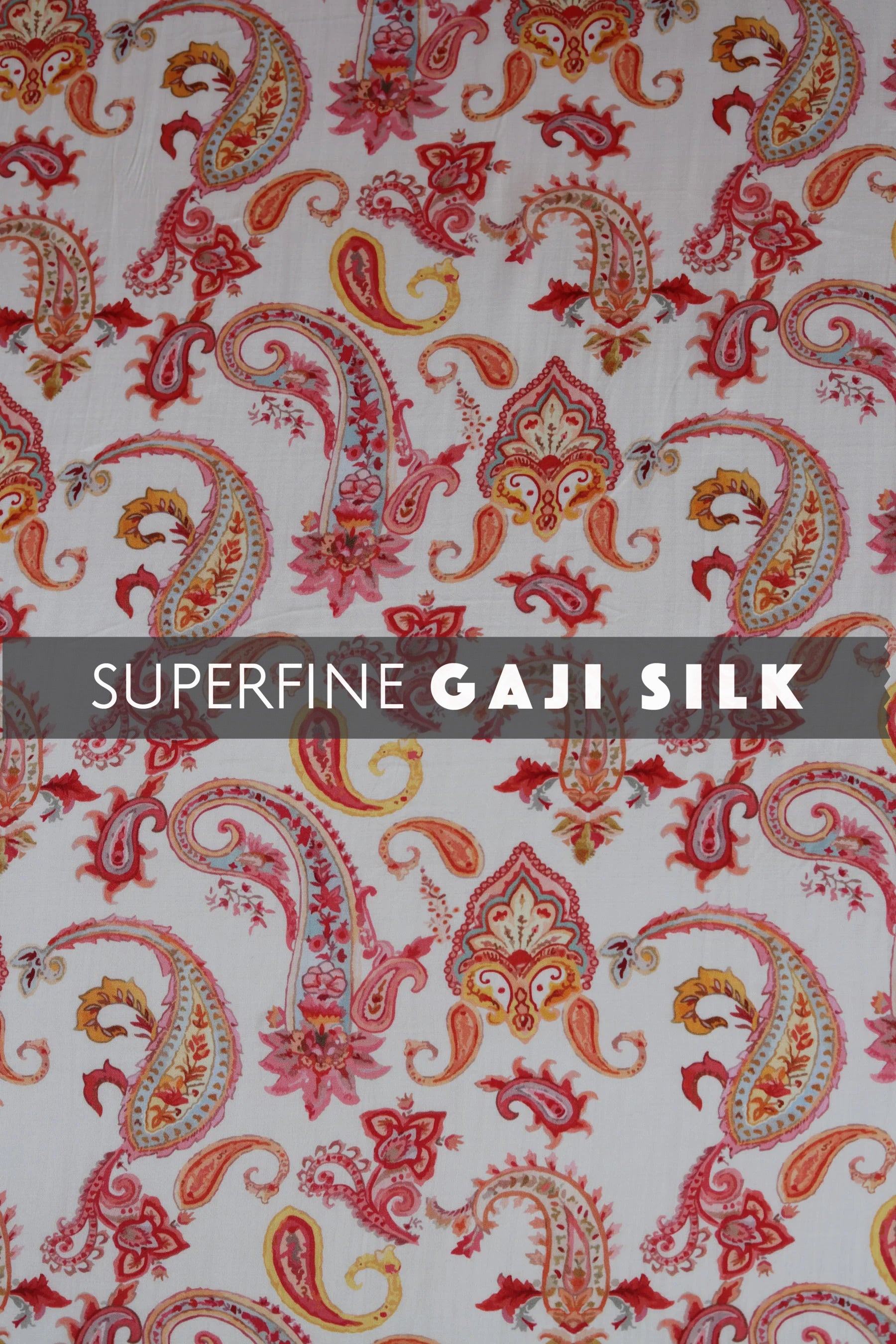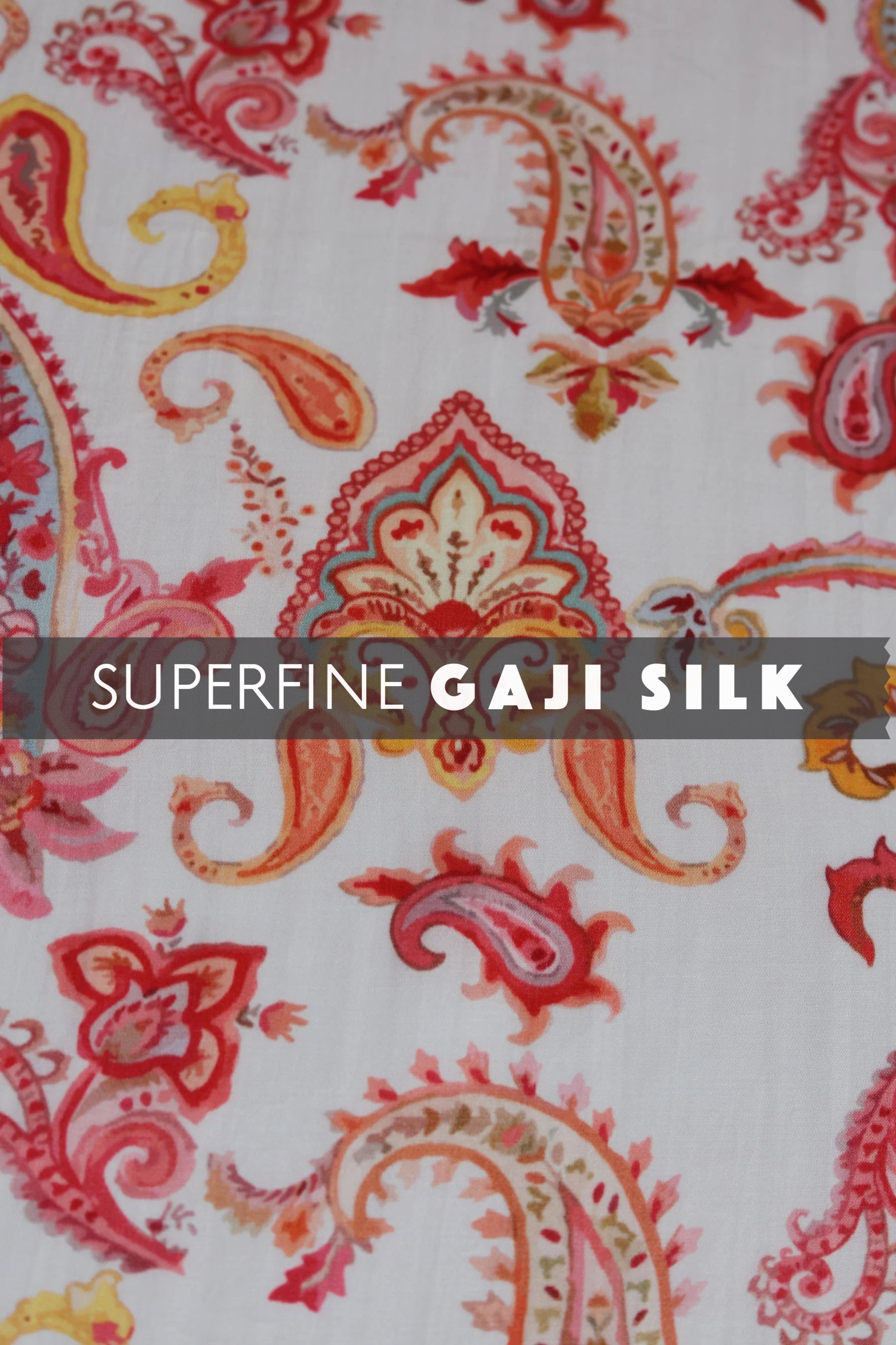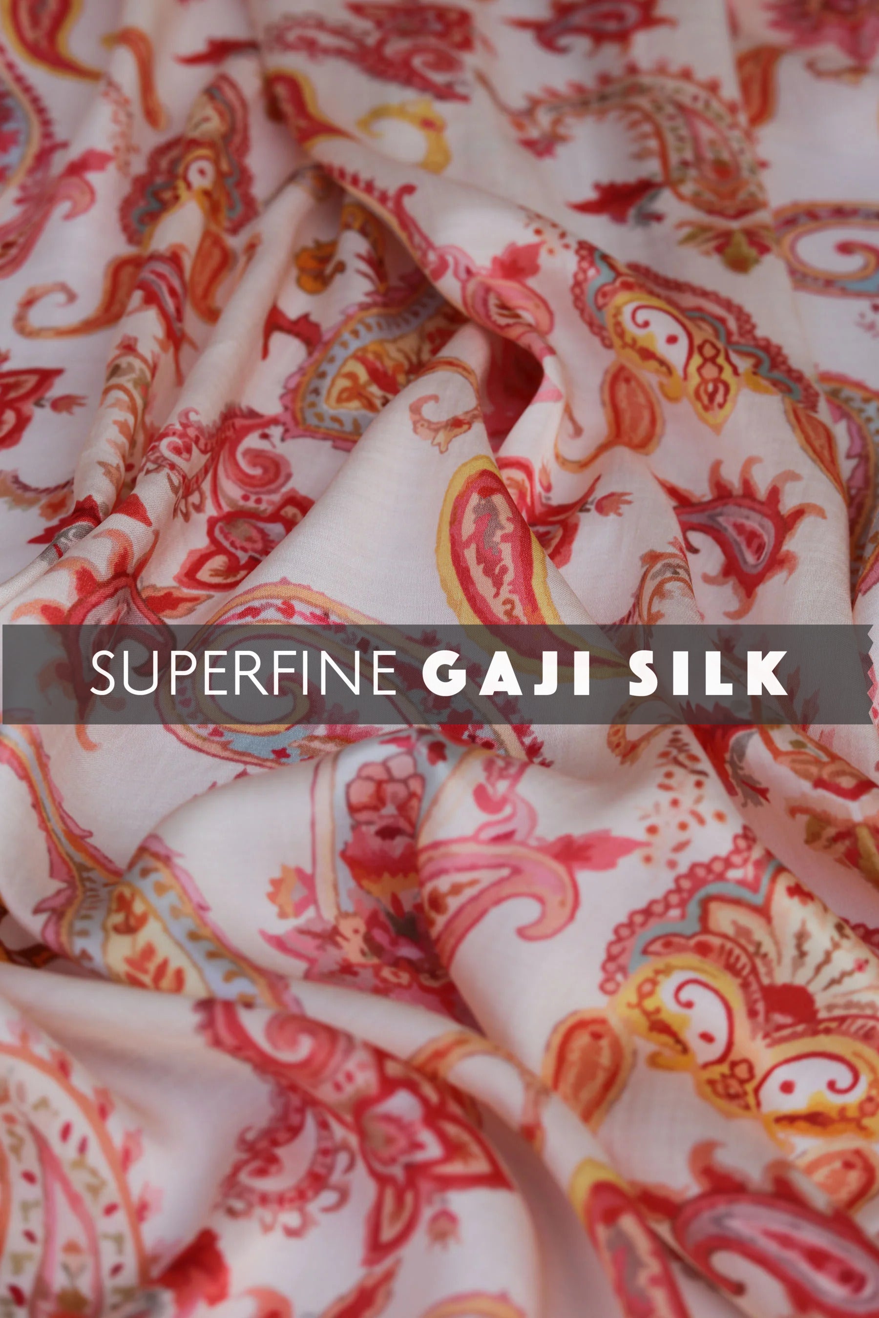 Experience opulent grace with the Cream Deco Paisley printed Gaji silk fabric. With its premium quality, it features a natural sheen and high glossy surface, offering a lustrous finish and luxurious softness that drapes with mesmerizing fluidity. Embrace its sustainable, nature-based essence while designing exquisite occasion wear co-ord sets, elegant sarees, captivating dupattas, as well as chic tops, shirts, and dresses that epitomize timeless elegance.
