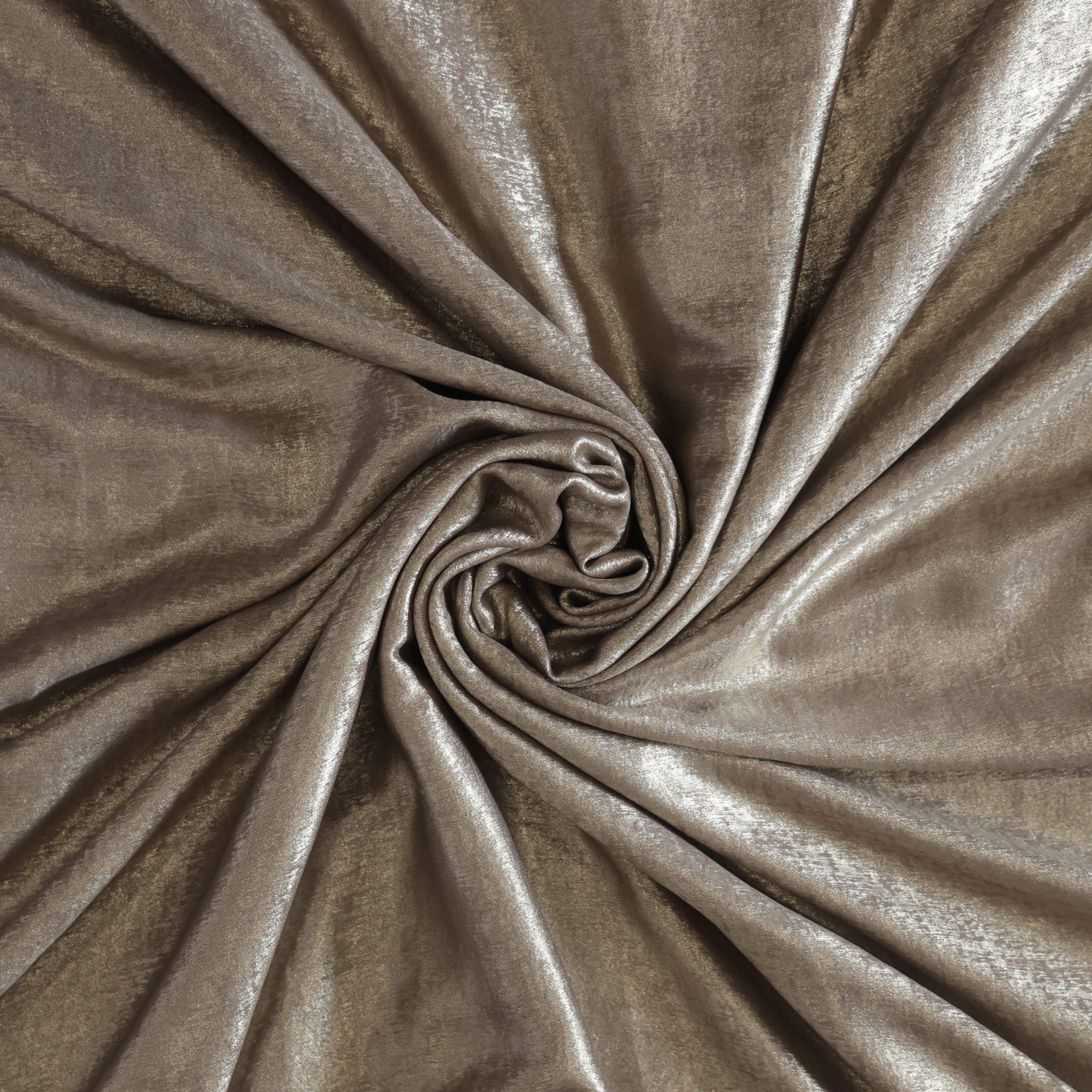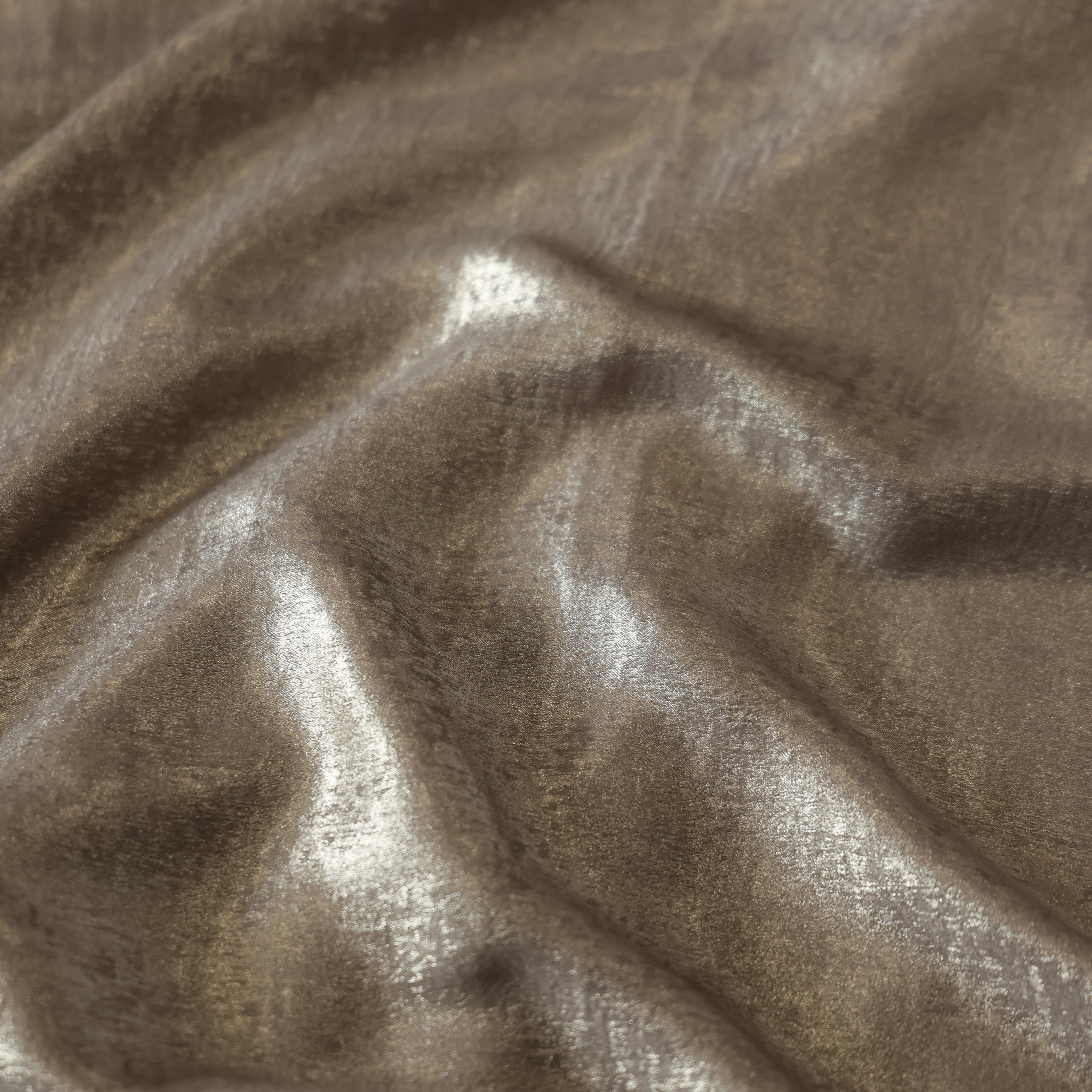 The image captures a close-up view of a luxurious fabric with a soft, shimmering surface. The material appears to be velvet or a similar plush textile, with a smooth and lustrous sheen that reflects light in varying intensities. Gentle folds and ripples create a natural play of highlights and shadows, emphasizing the fabric’s rich texture and fluid drape. The color is a muted champagne-taupe with silvery undertones, giving it an elegant, almost metallic glow. The overall effect is sophisticated and tactile, evoking a sense of luxury and refinement.