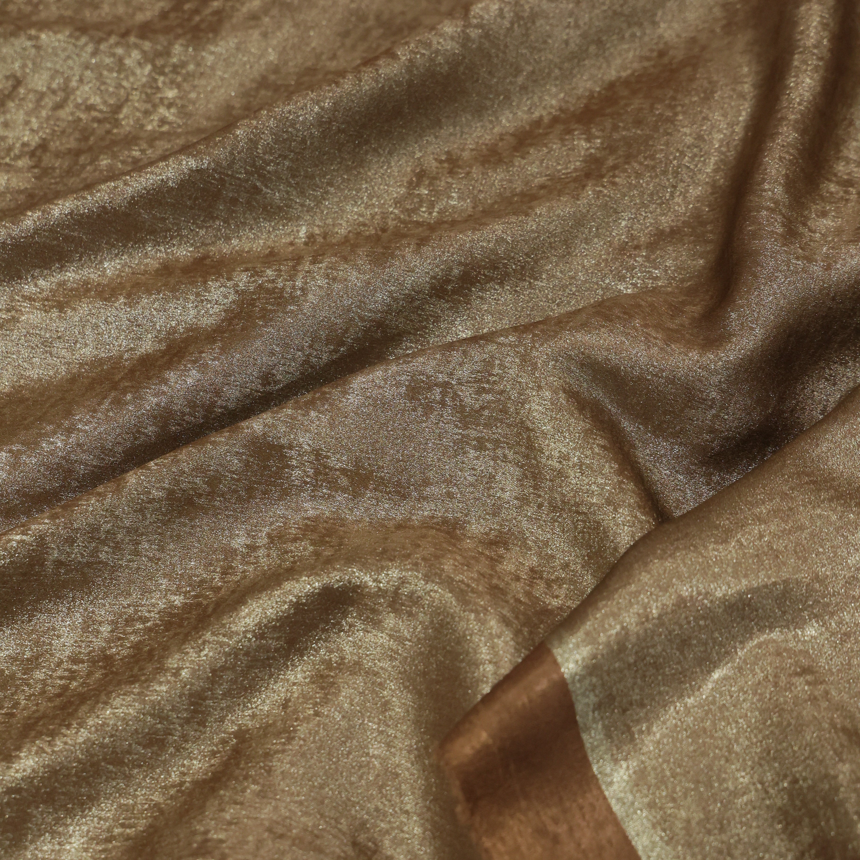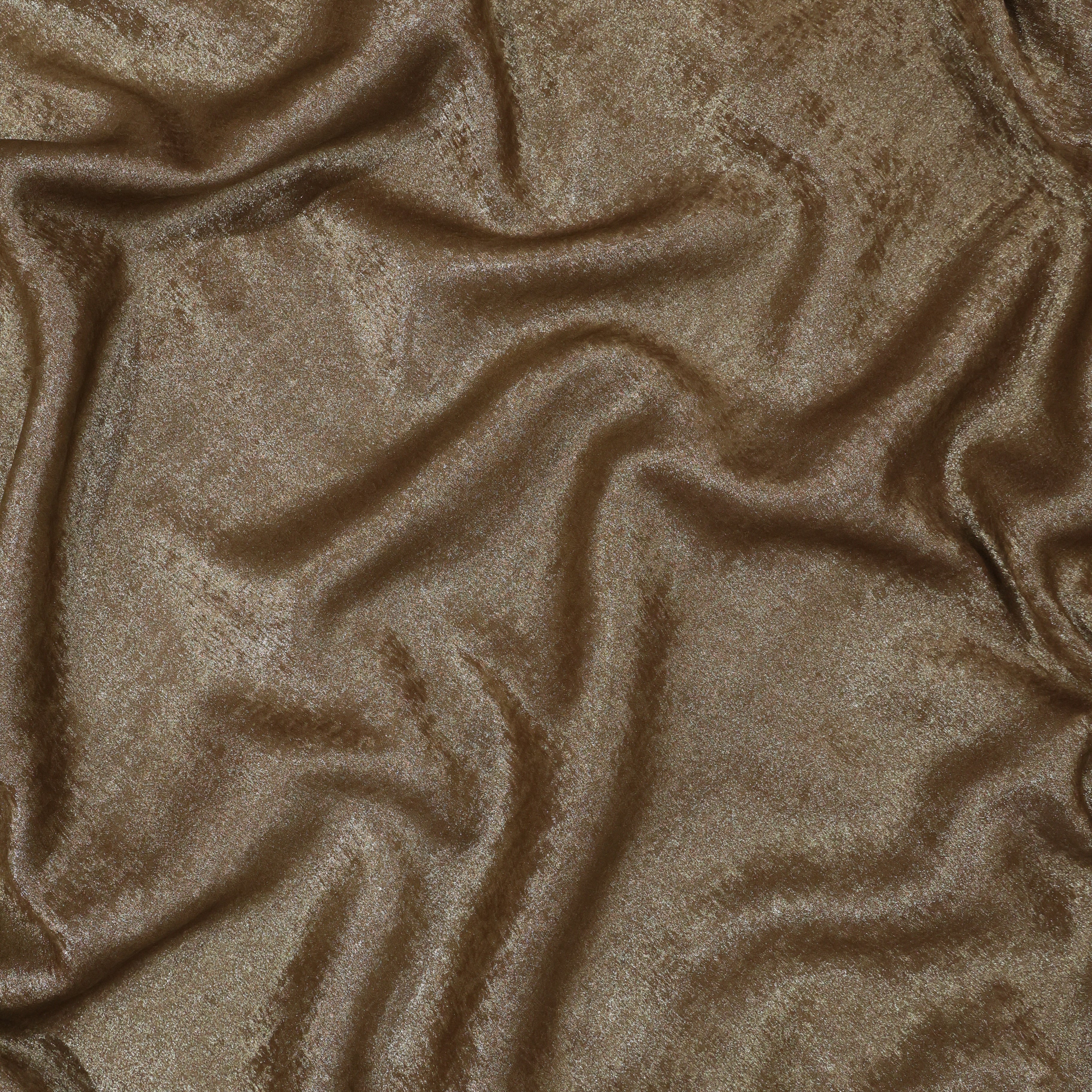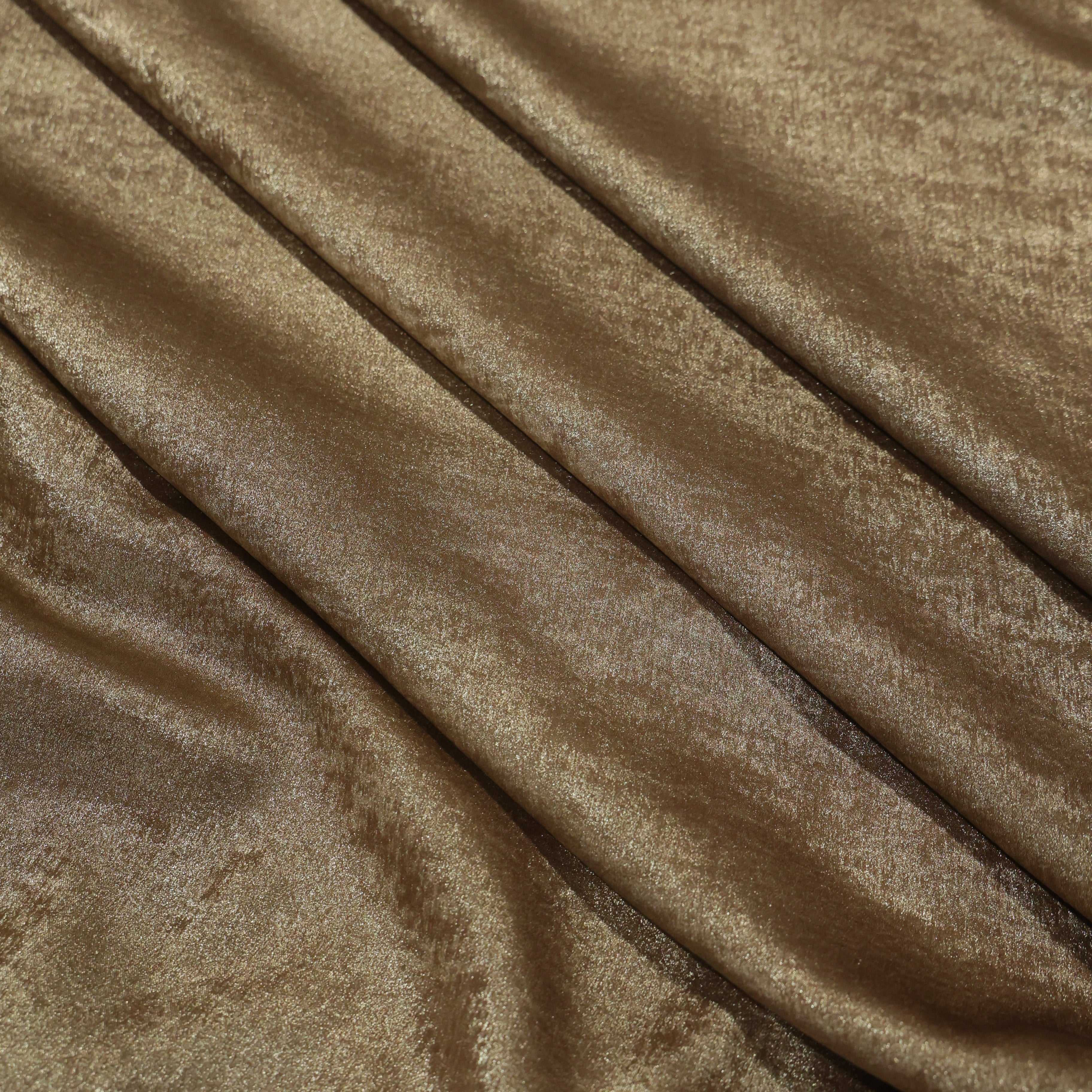 The image captures a close-up view of a luxurious fabric with a soft, shimmering surface. The material appears to be velvet or a similar plush textile, with a smooth and lustrous sheen that reflects light in varying intensities. Gentle folds and ripples create a natural play of highlights and shadows, emphasizing the fabricβs rich texture and fluid drape. The color is a muted champagne-taupe with silvery undertones, giving it an elegant, almost metallic glow. The overall effect is sophisticated and tactile, evoking a sense of luxury and refinement.
