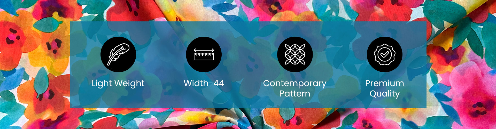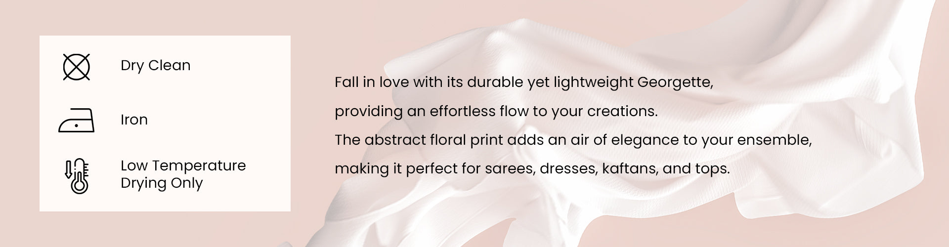Unleash your artistic side with our Multicolored Abstract Floral Printed Georgette Fabric, thoughtfully crafted from eco-poly blended materials. Fall in love with its durable yet lightweight appeal, providing an effortless flow to your creations. The abstract floral print adds an air of elegance to your ensemble, making it perfect for sarees, dresses, kaftans, and tops. Experience the semi-sheer quality that gracefully showcases your style. The grainy feel and crinkly finish create a captivating texture that enhances the charm of this fabric. Embrace its contemporary pattern, allowing you to create versatile looks for various occasions. Revel in the breathable comfort offered by this georgette fabric, ensuring you feel as good as you look. Let the burst of multicolor take center stage, bringing an element of joy and creativity to your wardrobe.