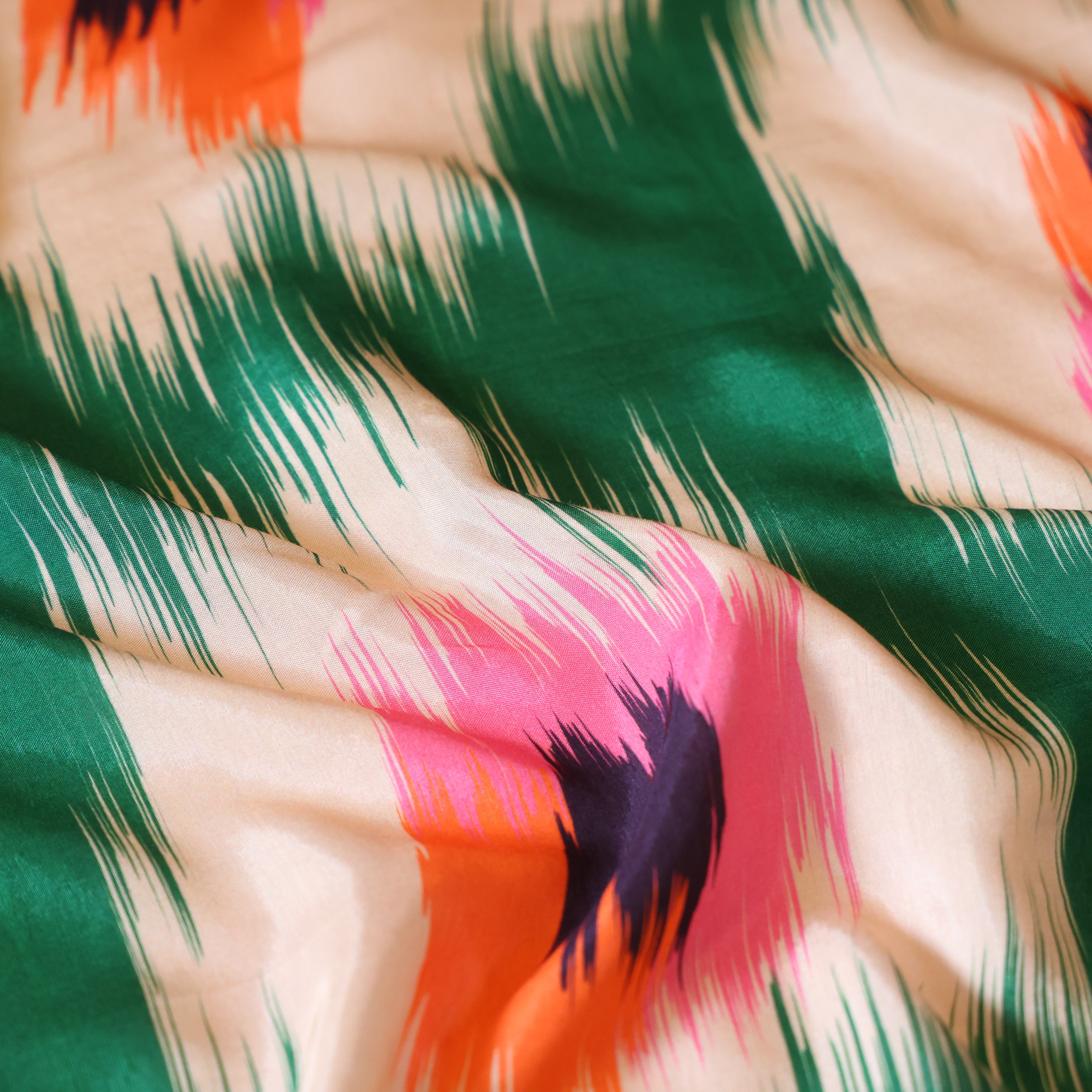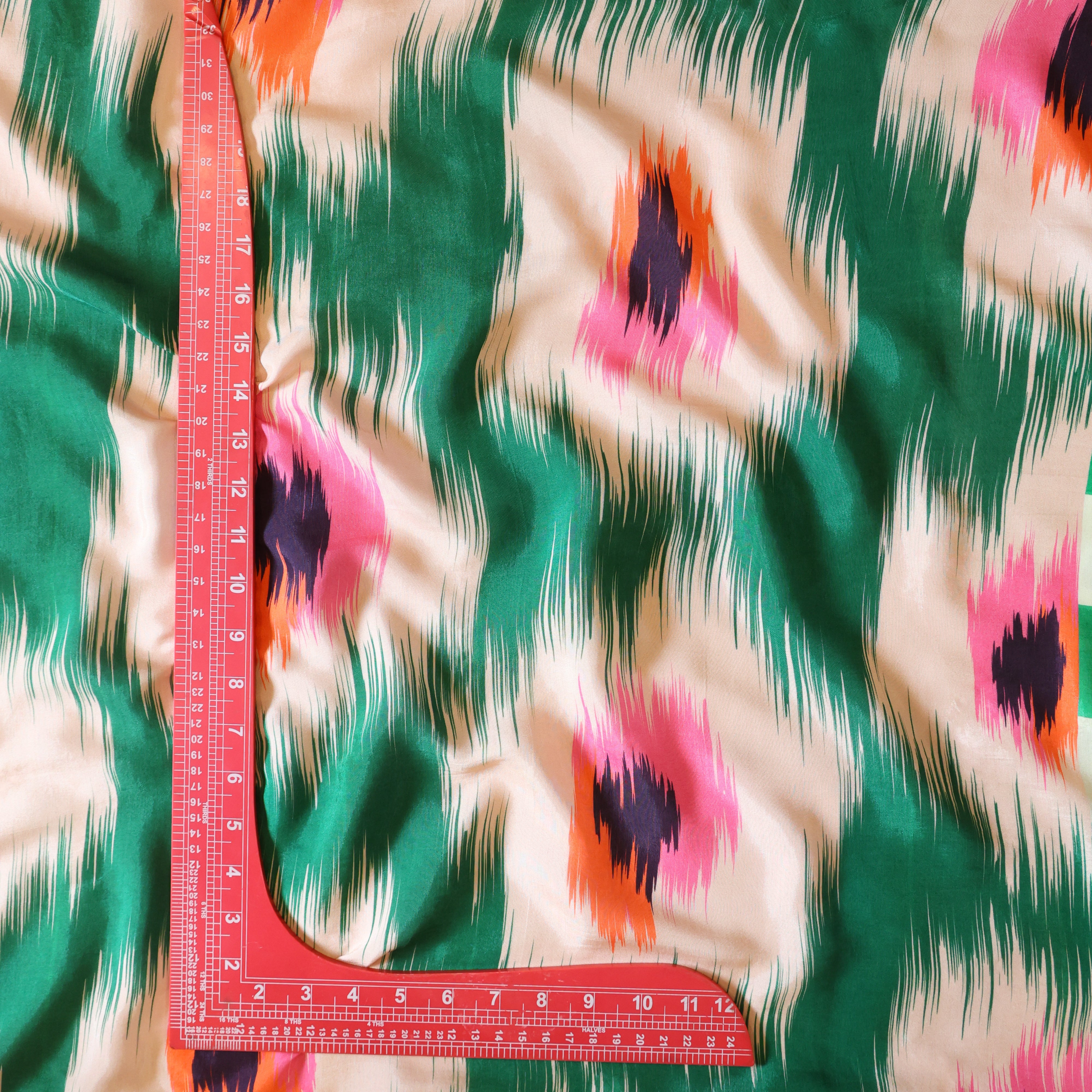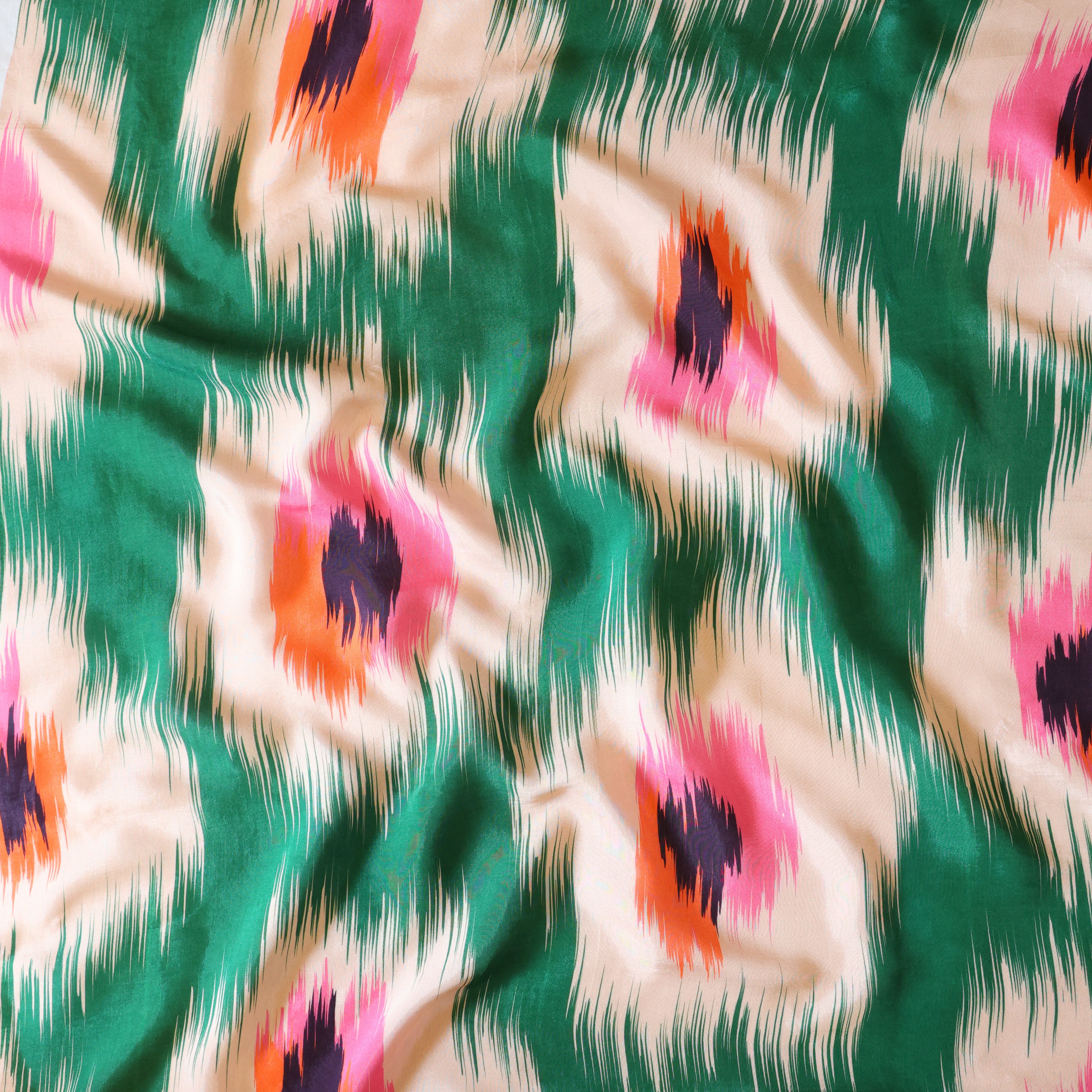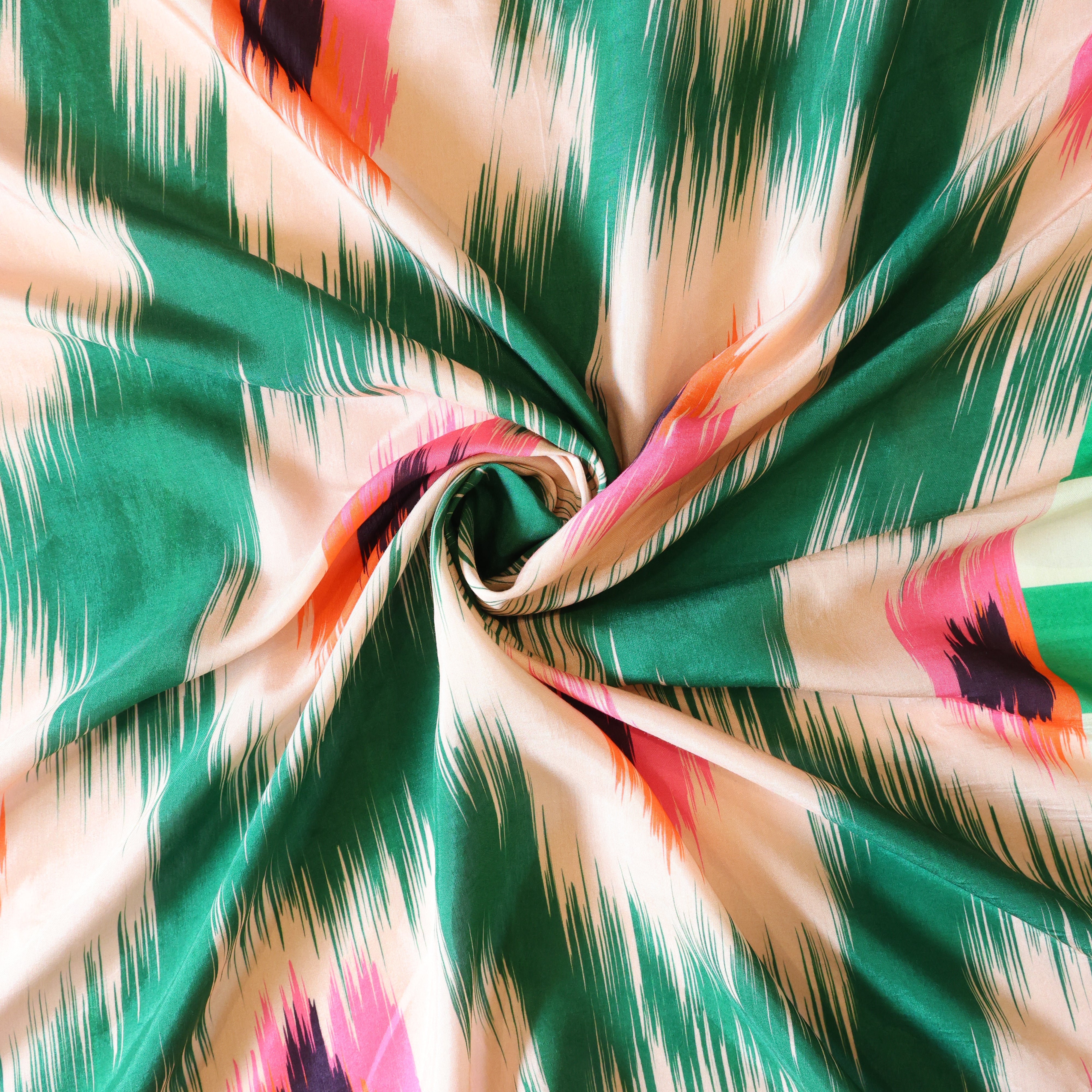 Natural Muslin Silk Emerald Green Ikat Inspired Pattern Printed Fabric