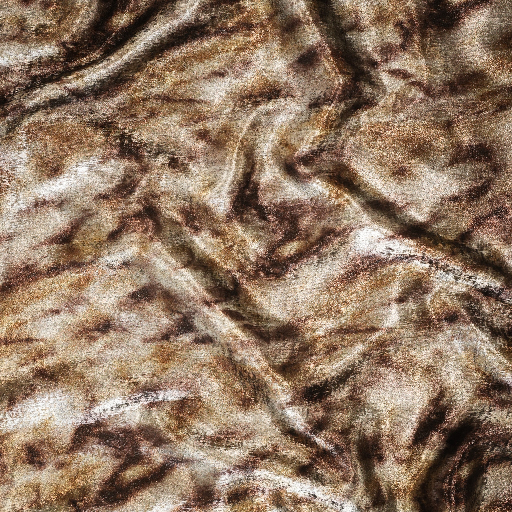 The blend of light and dark earthy tones creates depth and movement across the fabric, while the subtle shine adds richness and sophistication. The fluid drape and soft texture allow the fabric to fall gracefully, making it ideal for both structured and flowy silhouettes.