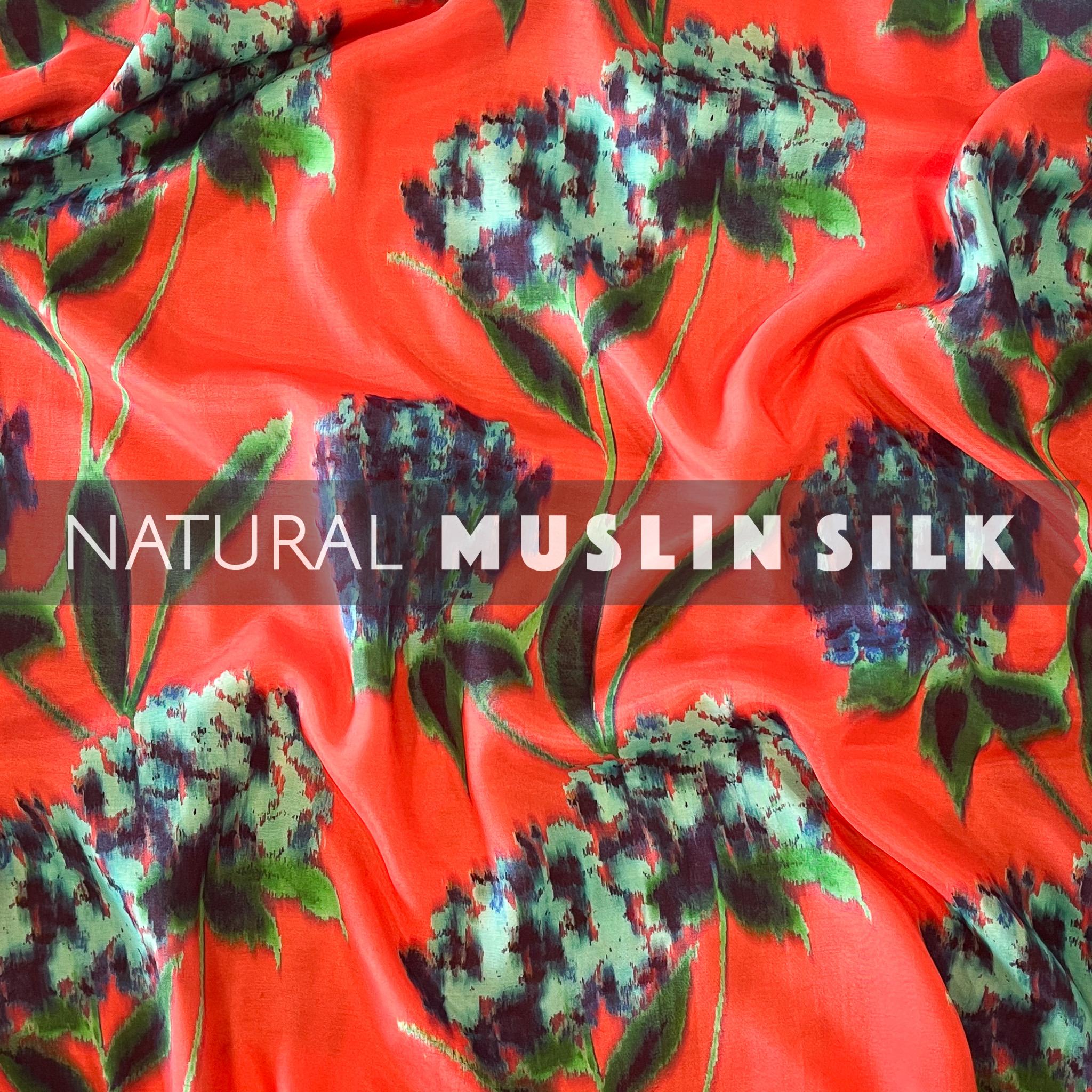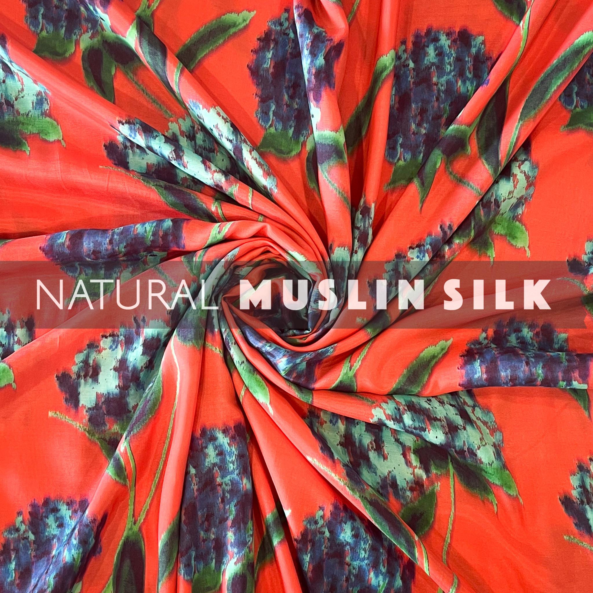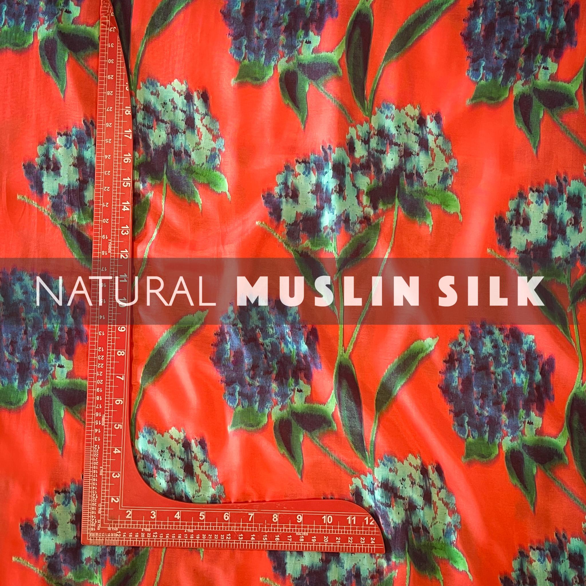 Tomato Pink Floral Printed Natural Muslin Silk Fabric